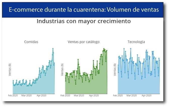 Los sectores que evidencian mayor crecimiento en el ultimo mes son: Comida y restaurantes (131%); Moda y calzado (122%), Ventas por catálogo (81%), Servicios Médicos (41%) y Tecnología (11%). Dentro de la categoría comidas, que es una de las que más crecimiento ha tenido, se encuentran los supermercados, restaurantes y panaderías. Así mismo, el cierre masivo de restaurantes y medidas para evitar que la gente salga a la calle, aumentaron significativamente los servicios a domicilio.
